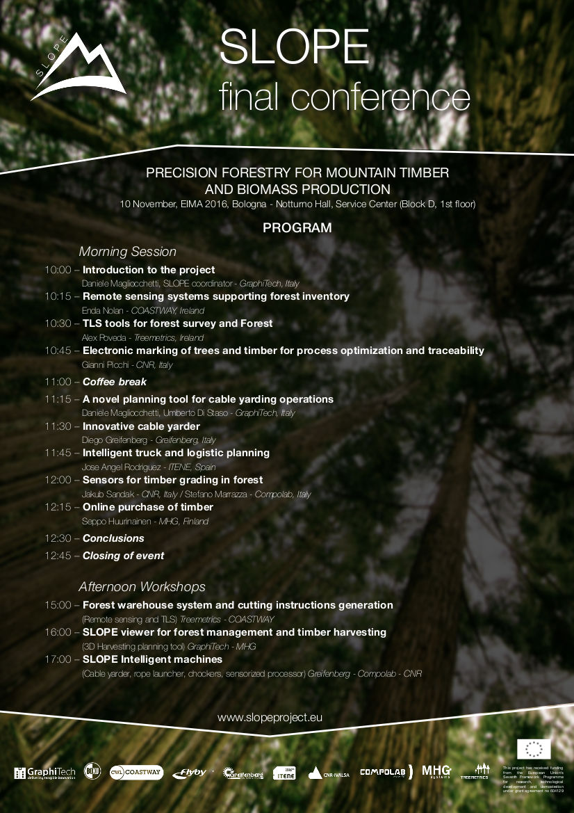 Graphitech is proud to invite all the interested parties to attend the final SLOPE conference "Precision forestry for mountain timber and biomass production" to be held at the EIMA International, Bologna, Italy, 10 November 2016. The conference will start at 10.00 and will end at 18.00. The program is divided in two sessions: Presentations (Morning) and Workshops (Afternoon).